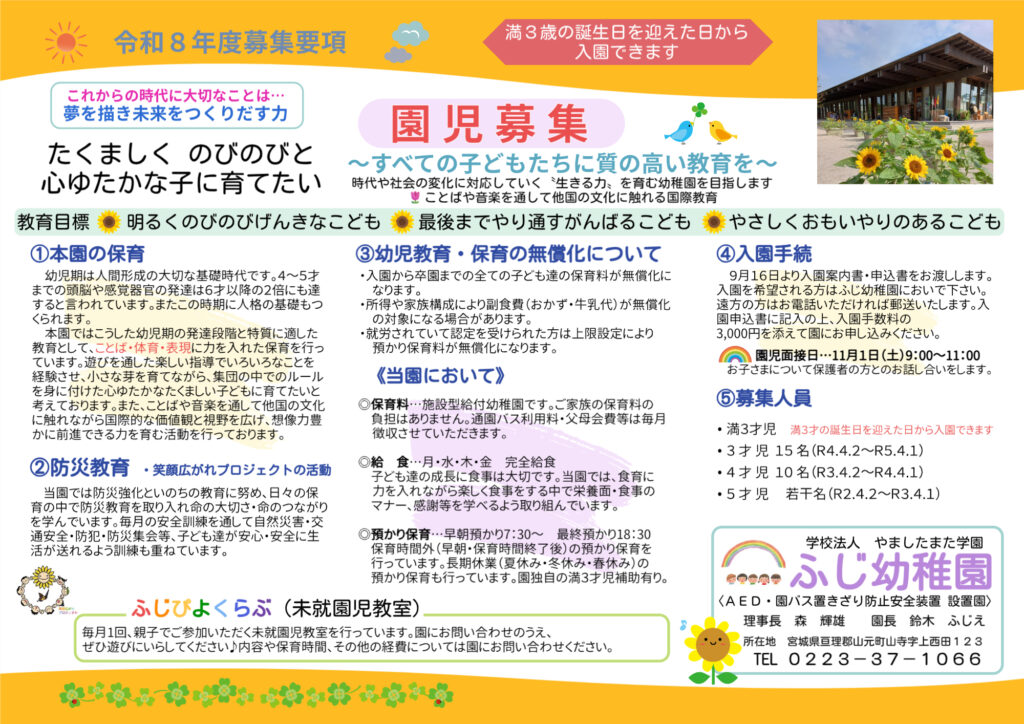 ふじ幼稚園について 令和8年度 園児募集 2025.09.16 2025.10.02 ふじ幼稚園について 見学やご質問等お気軽にご連絡ください♪ 🍉 夏祭り 🍉 前の記事 ひまわりが咲きました🌻 次の記事 関連記事 令和7年度 新学期がスタートしました! 2025.04.11 新年度が始まりました 2024.04.08 令和7年度 新入園児募集開始 2024.09.26